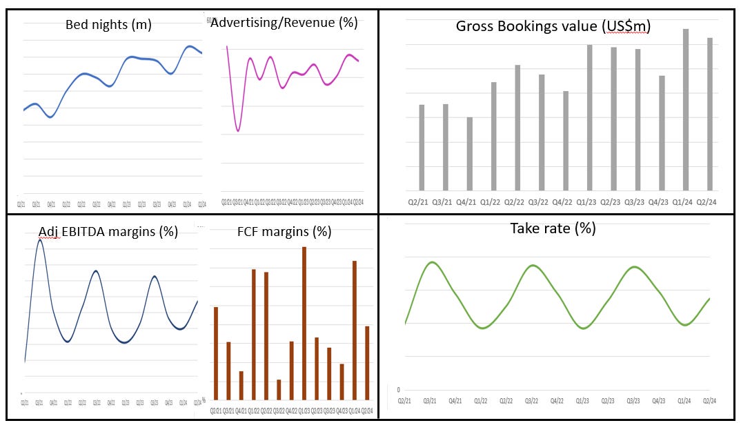 Sparkling. A Trading Update saw Hostelworld reaffirm FY Adj EBITDA of €21.6m. Net bookings, 5.4m +7% Y/Y driven by record performances in Asia and Central America. The Net average booking value of €13.54 -9% Y/Y, is due to a greater proportion of Asian destination bookings coupled with a slight increase in the proportion of solo customers. Net revenue €72.3m (-2% Y/Y). ‘Tut-tut’ you must be thinking, where is the sparkle? It is: (i) Direct marketing as a percent of revenue – down to 46%, from 51% in YTD '23. This was created from; (ii) the proportion of bookings from Social Members which increased to 80% (67% in YTD '23) – meaning that the social folks become more efficient to service enabling; (iii) Operating costs €18.7m, (-3% Y/Y) being 26% of net revenue, leading to (iv) YTD Adj EBITDA is €17.8m, that is +28% Y/Y and a 25% margin up from 19% in YTD '23. And of course, the improving unit economics feed down to the cash level so that cash is €7.8m, net cash position of €0.9m, with all bank debt repaid in full. Remembering that Marketing per cent of revenue was 60% of revenue in H1/22, we ponder possible scenarios for Hostelworld, given the success of its Social channels. Looking at that industry: Bumble has c25% of revenue in sales & marketing; Pinterest has 31%. As the ‘social’ model evolves Hostelworld has more potential for profit growth.