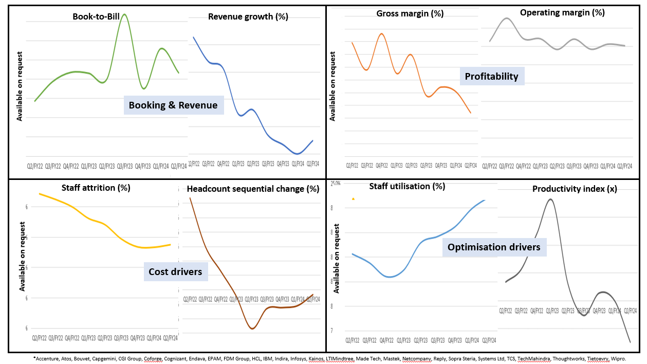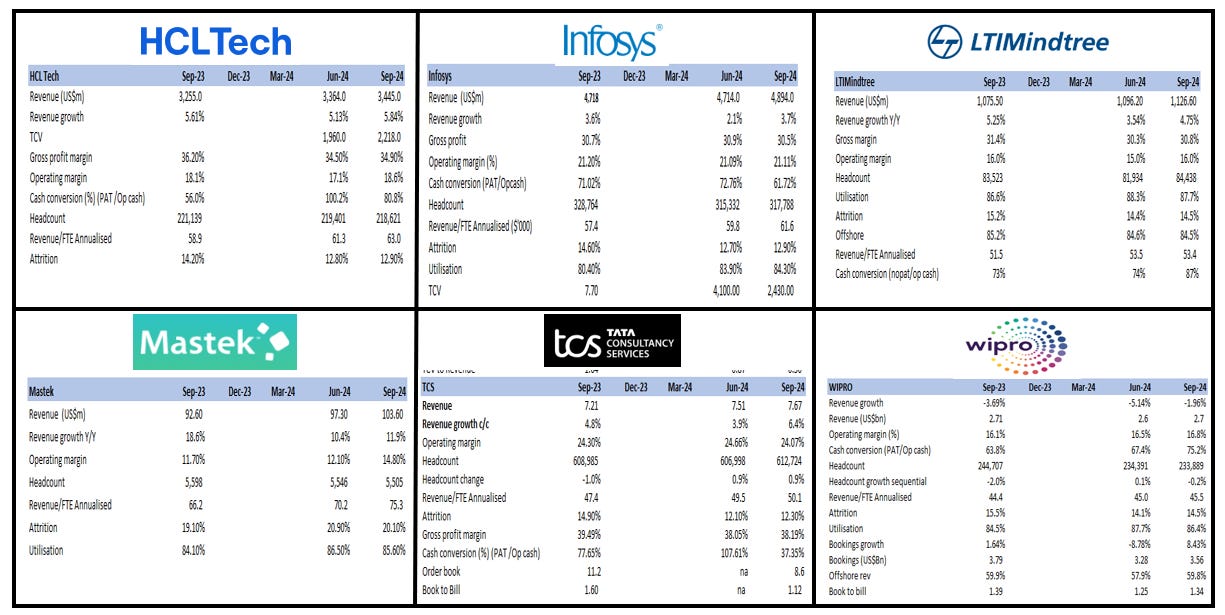 LTIMindtree. Q2 was a good quarter with broad-based sequential growth experienced across all verticals and geo’s leading to 2.8% growth. Debashis Chatterjee, CEO and MD commented that “as GenAI becomes pivotal in customer interactions, there is a noticeable trend of modernization efforts focusing on transforming the data estate” – messages which chime with those from TCS.